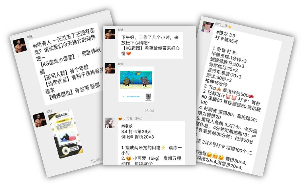 在全民居家隔離、居家辦公的特殊時(shí)期,KG運(yùn)動(dòng)運(yùn)營團(tuán)隊(duì),秉持“無測評(píng),不運(yùn)動(dòng)”理念,利用平臺(tái)優(yōu)勢聚集了康復(fù)師、健身教練、運(yùn)動(dòng)大咖等多方優(yōu)質(zhì)力量,建立了多個(gè)【線上居家科學(xué)運(yùn)動(dòng)打卡群】。以科學(xué)運(yùn)動(dòng)指導(dǎo)為核心,滿足用戶居家運(yùn)動(dòng)、交流互動(dòng)等健身、社交的需求,得到廣大用戶的支持及青睞。